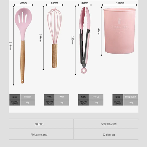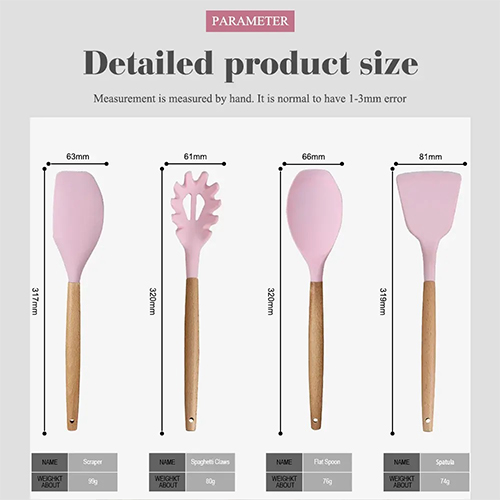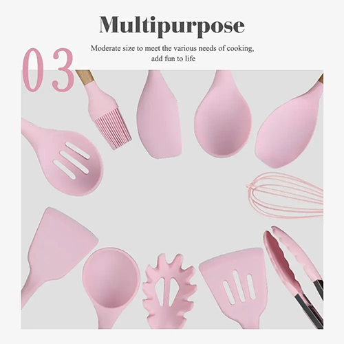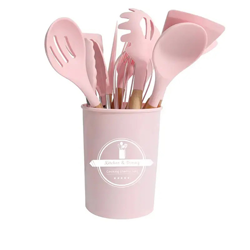 مجموعة أدوات طهي 11 قطعة من السيليكون الطبيعي مع مقابض خشبية بينك