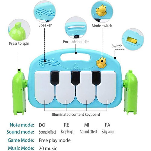 المحتويات: 1 سجادة مع البيانو، 5 ألعاب معلقة، 1 مرآة تفاعلية