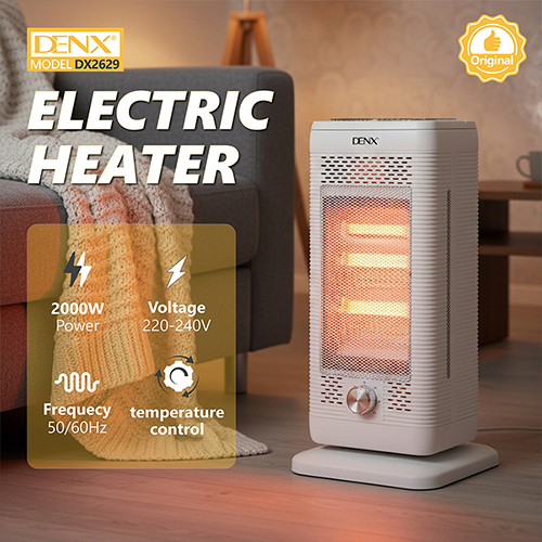 استمتع بالدفء مع دفاية كهربائية DENX DX2629 بقوة 2000 واط، بمؤقت، عجلات، و5 مستويات حرارة لتدفئة سريعة وآمنة في منزلك.