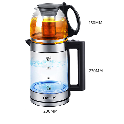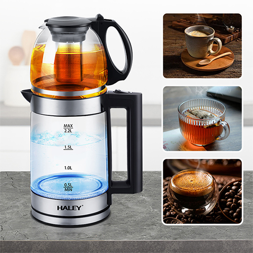 غلاية كهربائية 1.8 لتر من زجاج البوروسيليكات وستانلس ستيل، 1500 واط، غليان سريع، حماية من الغليان الجاف، إيقاف تلقائي، وإضاءة LED زرقاء لمستوى الماء.