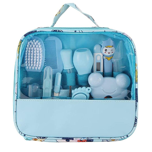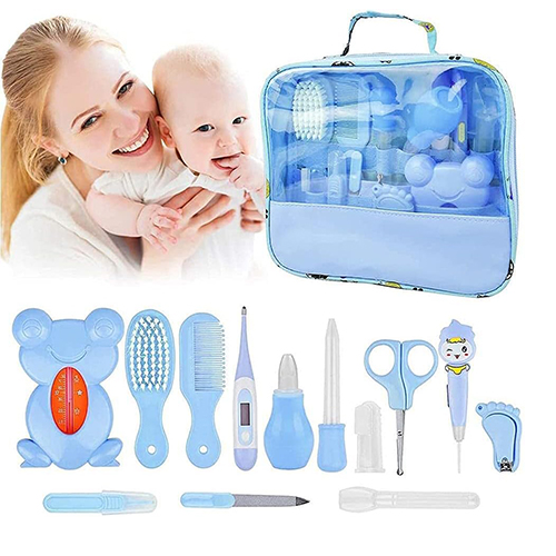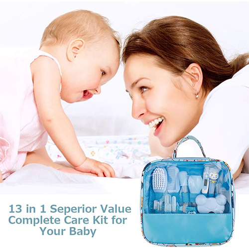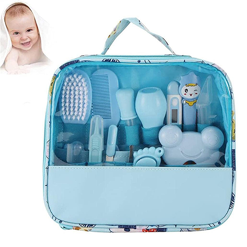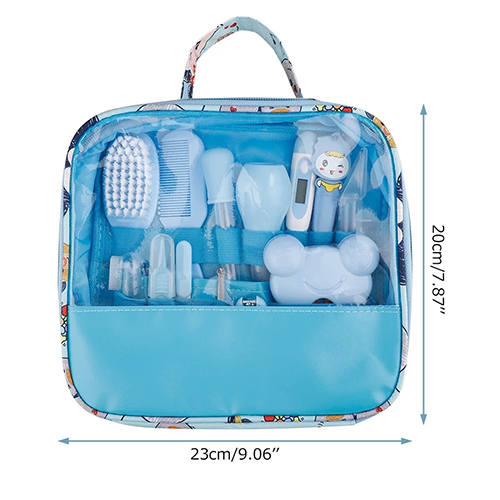 مجموعة أدوات العناية بالاطفال الرضع وحديثي الولادة مكونة من 13 قطعة مع حقيبة باللون الأزرق.